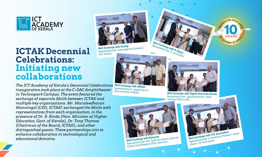 The events featured the exchange of separate Memorandums of Understanding (MoUs). In the south region event, MoUs were exchanged between ICTAK and C-DAC as well as Celonis, highlighting ICTAK’s dedication to fostering collaborations and driving technological progress. The agreements were exchanged by representatives including Ms. Deepa R.S. (Associate Director, Thiruvananthapuram) from C-DAC, Mr. Sreekumar K.V. (Head, Retail Operations) from ICTAK, Mr. Manjunath Gorur Chandrashekar (Senior Academic Alliance Manager, India) from Celonis, and Mr. Sajan M. (Head, Academic Operations) from ICTAK. Additionally, an MoU was exchanged during the north region event, with NIELIT and ICTAK, marking the beginning of a new era of collaboration aimed at providing students with extensive opportunities for growth, including training, certification, workshops, internships, and placement avenues. Ms. Sheela V.S. (Scientist ‘F’ from NIELIT Calicut) represented NIELIT during the exchange.